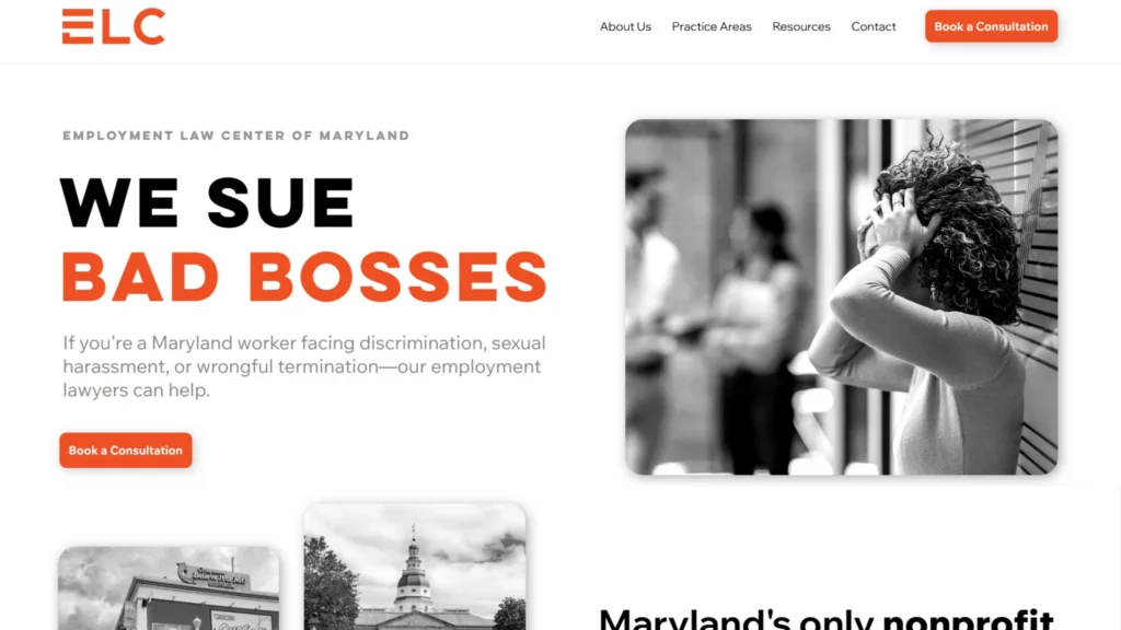 Clear taglines, FAQs, and calming visuals reduce stress for employment law clients.